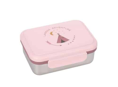 La boîte à goûter, Adventure Tipi, est idéale pour les enfants: Grâce à la combinaison de matériaux robustes tels que l’acier inoxydable et le polypropylène, la séparation amovible et la fermeture en silicone fixée dans le couvercle.