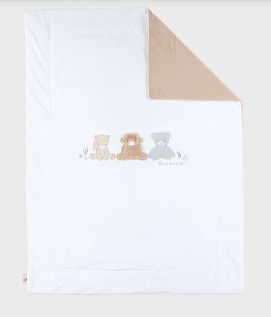 Plongez bébé dans un cocon de douceur avec cette couverture double face en Veloudoux® : un côté beige chaleureux, l’autre en écru lumineux. Au centre, une broderie délicate de petits personnages apporte une touche tendre et joyeuse. Une couverture pensée pour offrir confort et style à chaque moment.
