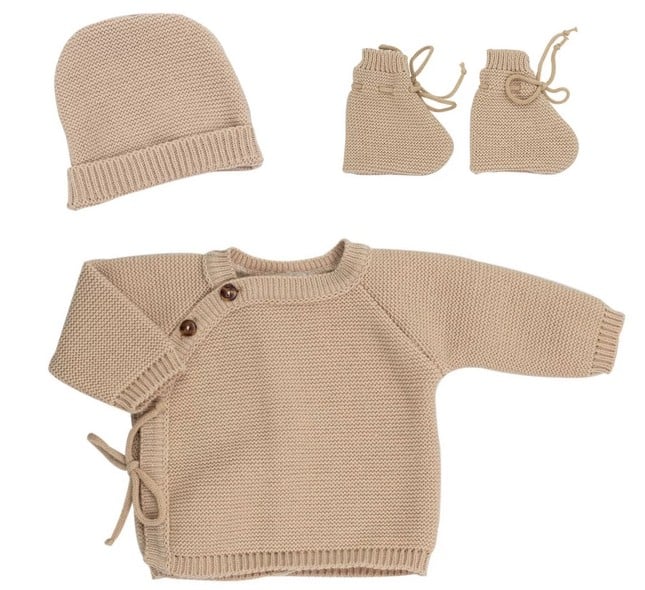 Pouponnez bébé avec douceur et confort. Ce lot brassière, chaussons et bonnet en maille sera parfait pour les premiers jours de votre bébé.