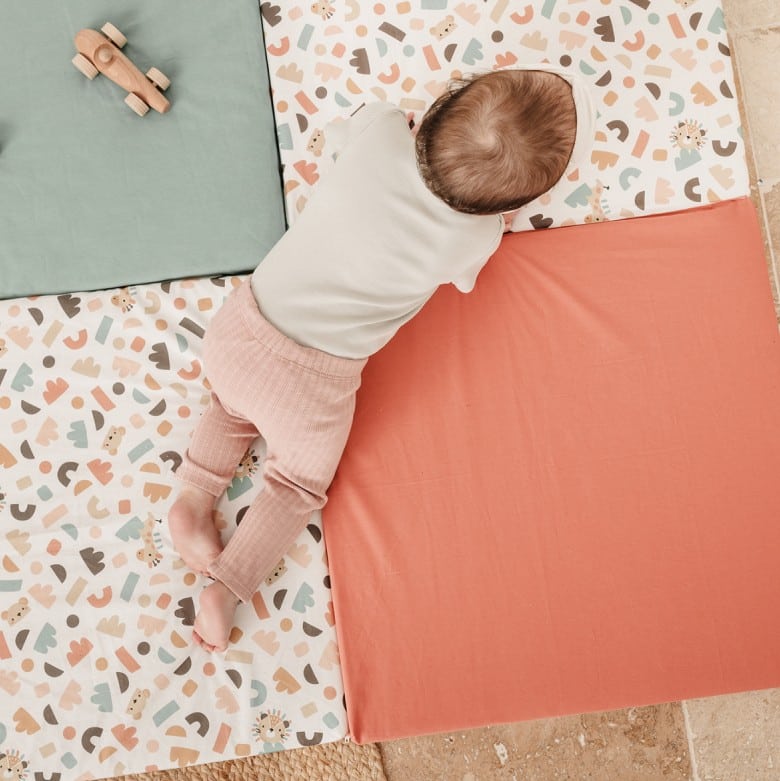 Ce tapis d’éveil Tinéo offre un espace de jeu attrayant pour aider le bébé à explorer et développer sa motricité en toute sécurité.