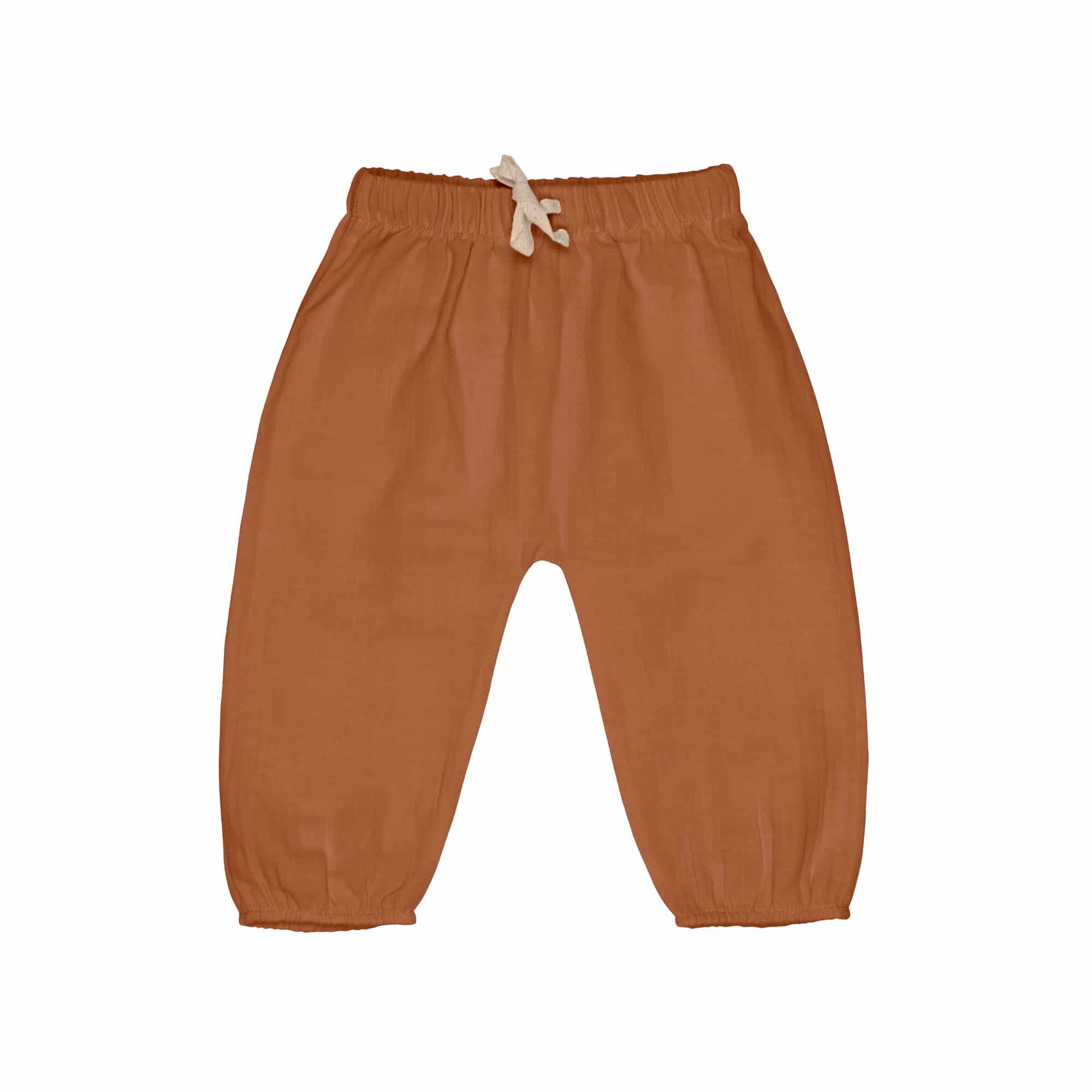 Le pantalon  en mousseline est composé de pur coton (bio) particulièrement doux sur la peau. La coupe s’adapte parfaitement à la morphologie des petits et aux bords- côtes élastiqués aux chevilles.