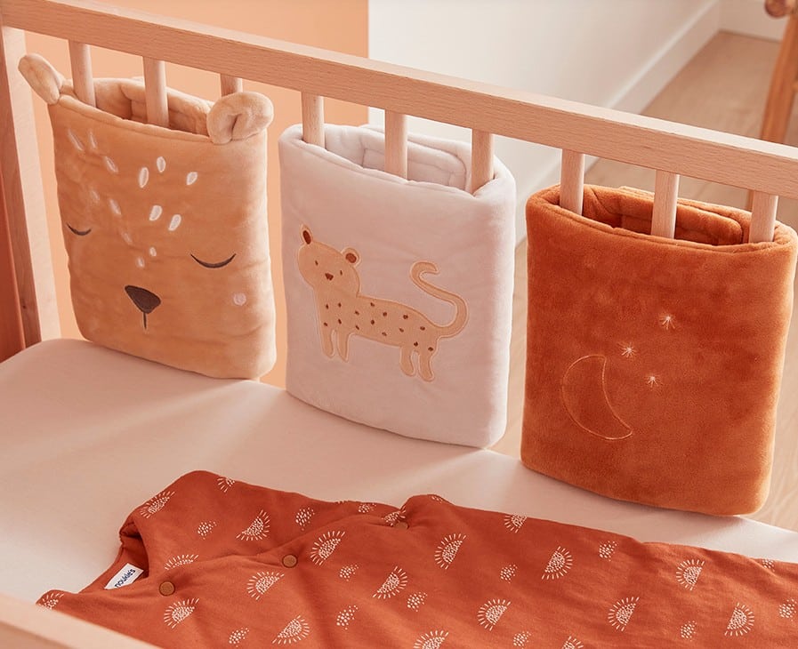 Placez-les sur les premiers barreaux près de la tête de bébé afin de le protéger. Fermeture par pattes autogrippantes pour s’adapter à tous les lits bébés.