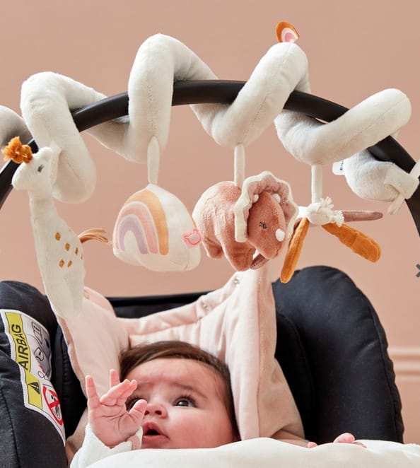 La spirale d’activités ludique de la collection Popsie, Gigi & Louli se fixe facilement au parc, siège auto groupe 0 ou encore poussette grâce à sa forme particulière et ses attaches en forme de C.