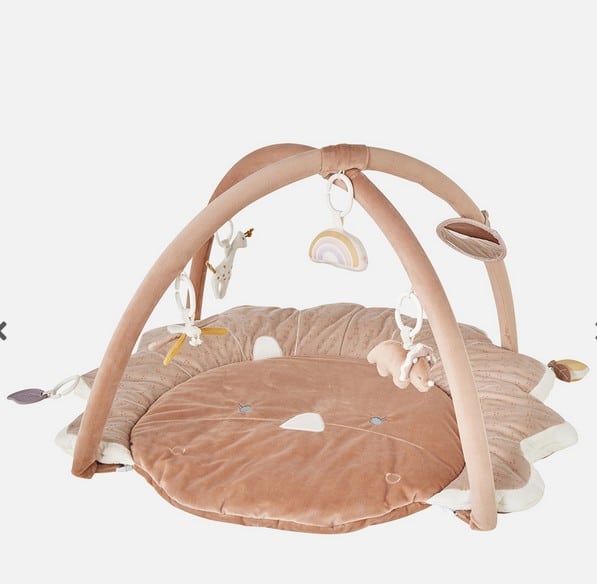 Le tapis d’éveil Popsie en Veloudoux® rose poudré est parfaitement adapté pour stimuler la motricité,